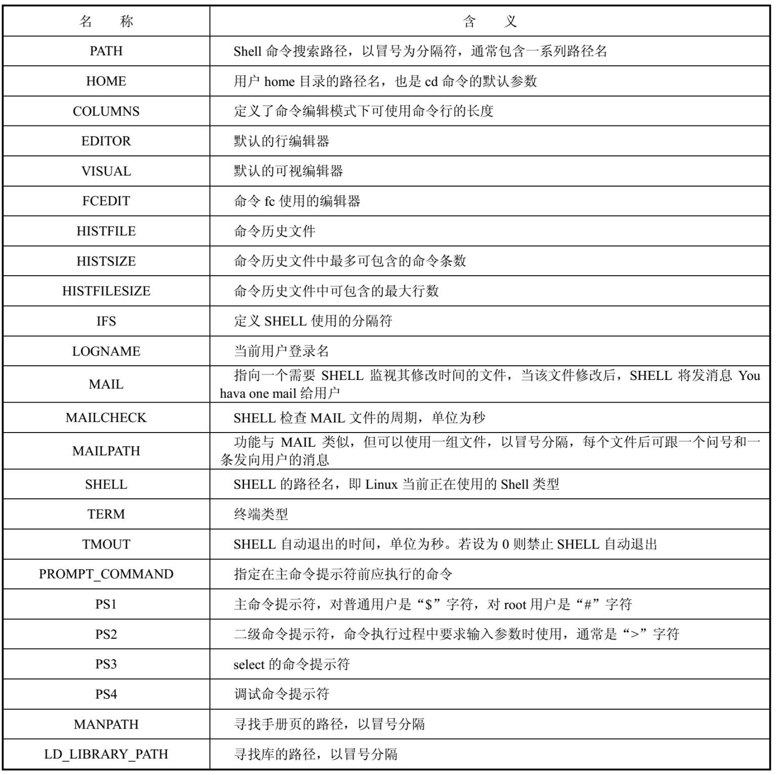 Shell环境变量是所有Shell 程序都会接收的参数。Shell程序运行时,都会接收一组变量,这组变量就是环境变量,最常见的环境变量是PATH、HOME、LOGNAME。环境变量通常采用大写字母命名,以便和用户在Shell脚本程序中定义的本地变量区别开来(后者一般使用小写字母命名)。Linux系统下Shell中常用的环境变量的含义描述如表2.2所示。