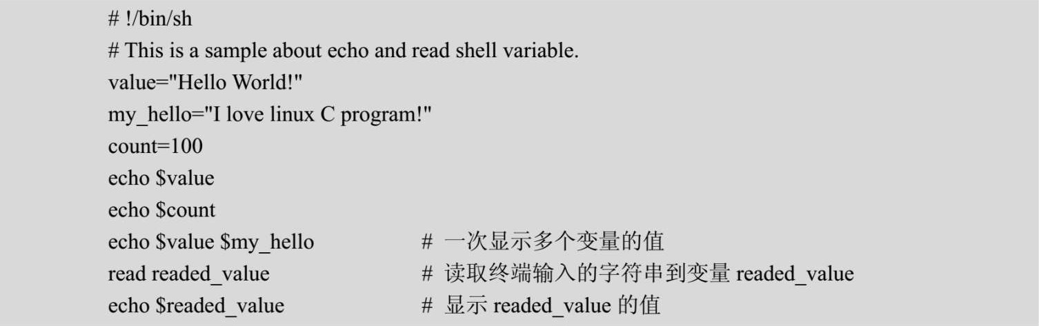 另外,使用echo命令显示变量的值,而使用read命令可以读入变量的值。程序2.2是一个关于应用Shell用户变量的例子,代码如程序2.2所示。