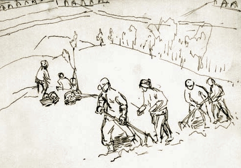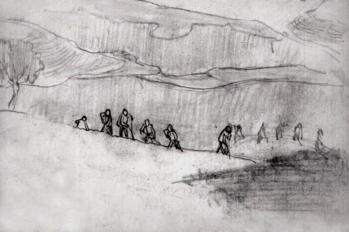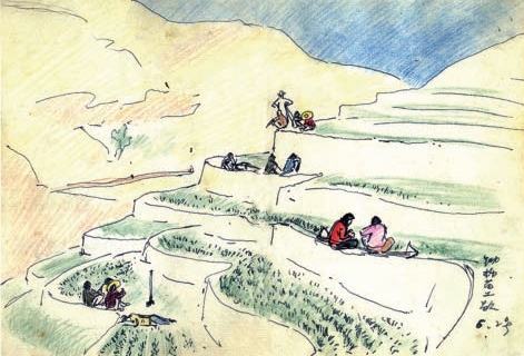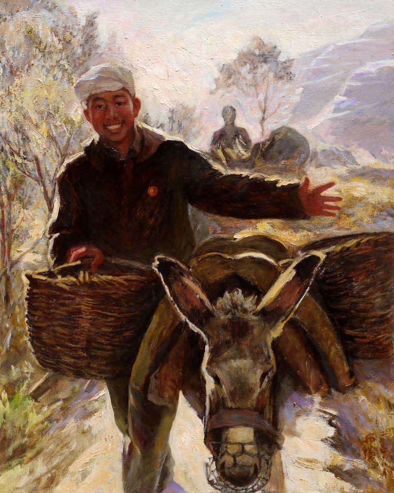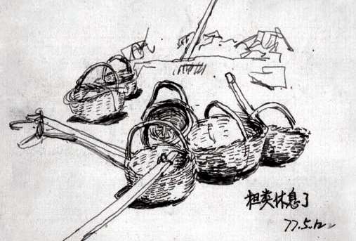 春天第一件真正的农活是往山上送粪,攒了一冬的羊圈里有薄薄的一层羊粪,用镢头砍下的一块块粪土还带着冰碴,这样的半筐土粪,少说也有八九十斤的份量。队里照顾我们知青女生,让我们往头顶的脑畔山上送,就是从我们住的窑洞上去最近的山头。开始虽然路程短,但会越送越远,因为第一担倒在刚上山的近处,第二担就要离开一段距离,这样越倒越往上。山道弯曲、窄小、陡直,我们刚开始都不会换肩,扁担压碾着我们娇嫩的皮肉和筋骨,锥骨刺心,但一天下来我们每人竟往山上送了二十趟粪。