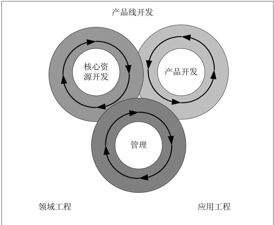从本质上看,产品线开发包括核心资源库的开发和使用核心资源的产品开发,这两者都需要技术和组织的管理。核心资源的开发和产品开发可同时进行,也可交叉进行,例如,新产品的构建以核心资源库为基础,或者核心资源库可从已存在的系统中抽取。有时,我们把核心资源库的开发也称为领域工程,把产品开发称为应用工程。图1-1说明了产品线各基本活动之间的关系。