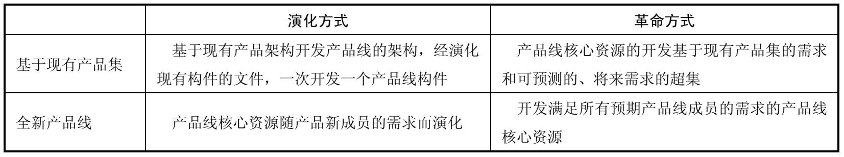 引入产品线开发过程采用的方式基于两种考虑:演化方式(evolutionary)、革命方式(revolutionary),是基于现有产品还是开发全新的产品线。这四种方式基本特征如表1-2所示。下面对这几种方式进行简要分析。