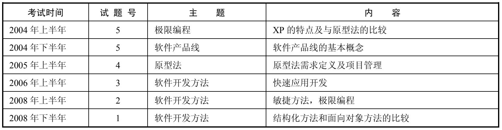 在2004年至2013年的考试试题中,共有6道试题和软件开发方法有关,本节主要分析这6道试题。在本节的试题中,其考查范围如表1-1所示。