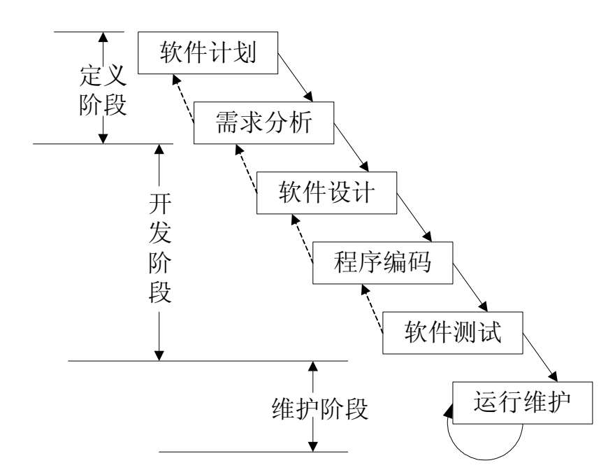 瀑布模型是一种严格定义方法,它将软件开发的过程分为软件计划、需求分析、软件设计、程序编码、软件测试和运行维护6个阶段,形如瀑布流水,最终得到软件产品,如图1-3所示。