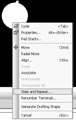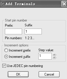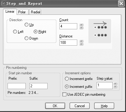 单击绘图工具栏中的“Terminal”图标,弹出“Add Terminals”对话框,如图7.3所示。在此对话框中,“Prefix”(前缀)栏不填;在“Suffix”(后缀)栏中输入1,表示封装编号从1开始;“Step value”栏表示步进值。单击“OK”按钮后,在工作区中单击鼠标左键,即可添加一个引脚。如图7.4所示,选中该引脚后,单击鼠标右键,从弹出的菜单中选择“Step and Repeat”(分布和重复),弹出“Step and Repeat”对话框,如图7.5所示。在“Step and Repeat”对话框“Linear”选项卡的“Direction”区域选择向上(Up)、向下(Down)、向左(Lift)或向右(Right)等;“Count”栏表示向该方向添加引脚的数量;“Distance”栏表示引脚与引脚之间的间距。设置好参数后,单击“OK”按钮即可。
