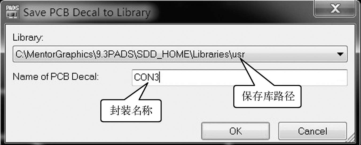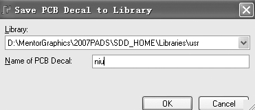 确认各项参数无误后,单击工具栏中的保存按钮,弹出“Save PCB Decal to Library”对话框,如图7.43所示。在“Library”栏中设置保存库路径,在“Name of PCB Decal”栏中输入封装名称,然后单击“OK”按钮即可。