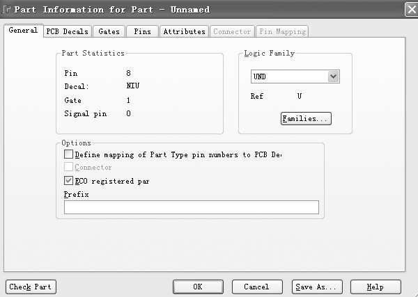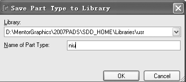 单击“保存”按钮,即可弹出“Save PCB Decal to Library”对话框,如图7.12所示。在“Library”栏中设置库文件所在目录,在“Name of PCB Decal”栏中输入相应的PCB封装名称,单击“OK”按钮,弹出提示窗口,如图7.13所示。单击“是”按钮,弹出“Part Information for Part—Unnamed”对话框,如图7.14所示。单击“OK”按钮,弹出“Save Part Type to Library”对话框,如图7.15所示。在“Library”栏中设置库文件所在目录,在“Name of Part Type”栏中输入相应的PCB封装名称,单击“OK”按钮,即可完成保存工作。如图7.16所示,执行菜单命令“File”→“Exit Decal Editor”,即可退出封装库制作。