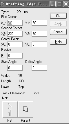 如图7.6所示,单击绘图工具栏中的“2D Line”图标,即可绘制丝印边框。绘制好丝印边框后,按“Esc”键退出绘制丝印边框状态。双击该边框,弹出“Drafting Edge Properties”对话框,如图7.7所示。单击“Parent”按钮,弹出“Drafting Properties”对话框,如图7.8所示。在“Layer”(层)栏中选择“Sillkscreen Top”(丝印顶层),将“Width”(线宽)栏设置为0.2mm。单击“Apply”按钮后,单击“OK”按钮退出。如果边框未显示,可按图7.9所示执行菜单命令“Setup”→“Display Colors”,弹出“Display Colors Setup”对话框,如图7.10所示。对相应边框层的颜色进行设置后,单击“Apply”按钮,然后单击“OK”按钮退出即可。绘制好的PCB封装如图7.11所示。