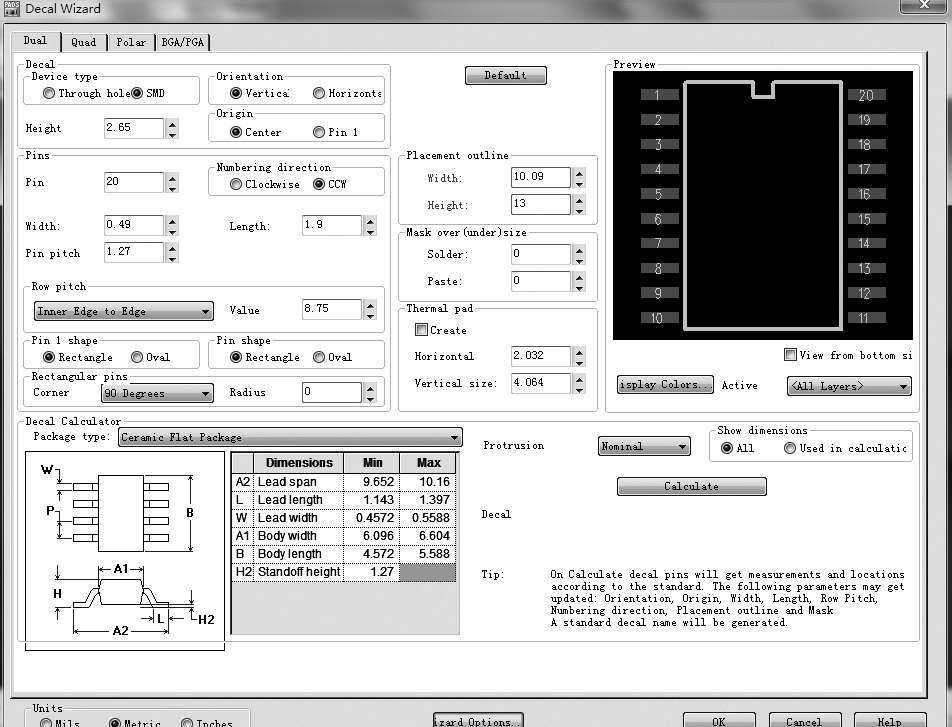 选择“Dual”选项卡,在“Device type”(元器件类型)区域选中“SMD”选项来制作SOP封装(若选中“Through hole”选项,则表示制作DIP封装)。根据元器件数据表中的封装尺寸说明,依次在“Decal Wizard”对话框中输入数据,主要包括焊盘数量、焊盘宽度、焊盘长度(焊盘长度要在引脚长度F的基础上加1mm,便于手工焊接)、相邻焊盘的中心距和左/右两列焊盘内边沿到内边沿的距离。