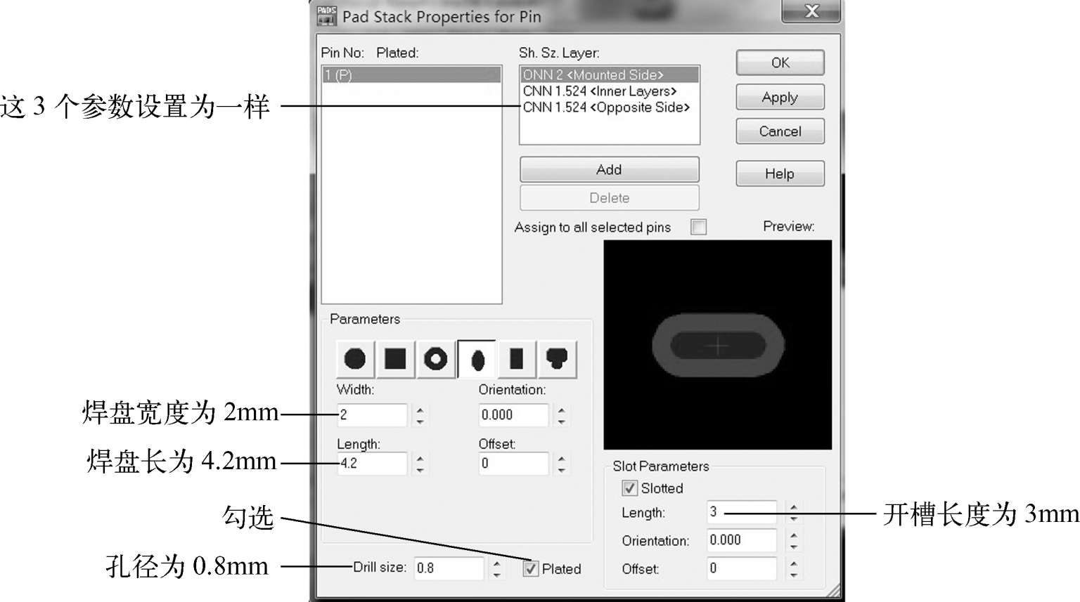 图7.34所示的是根据图7.33制作的槽型焊盘PCB封装。根据实物计算出槽型焊盘的长度为4.2mm,宽度为2mm;开槽的长度为3mm,宽度为0.8mm。