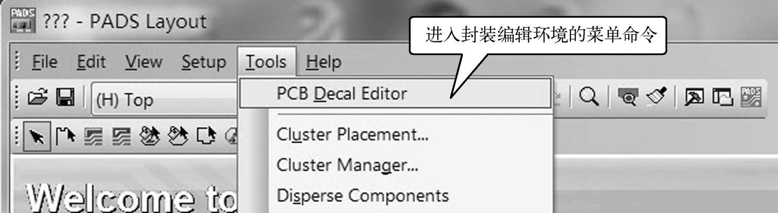 启动PADS Layout,执行菜单命令“Tools”→“PCB Decal Editor”,如图7.35所示。