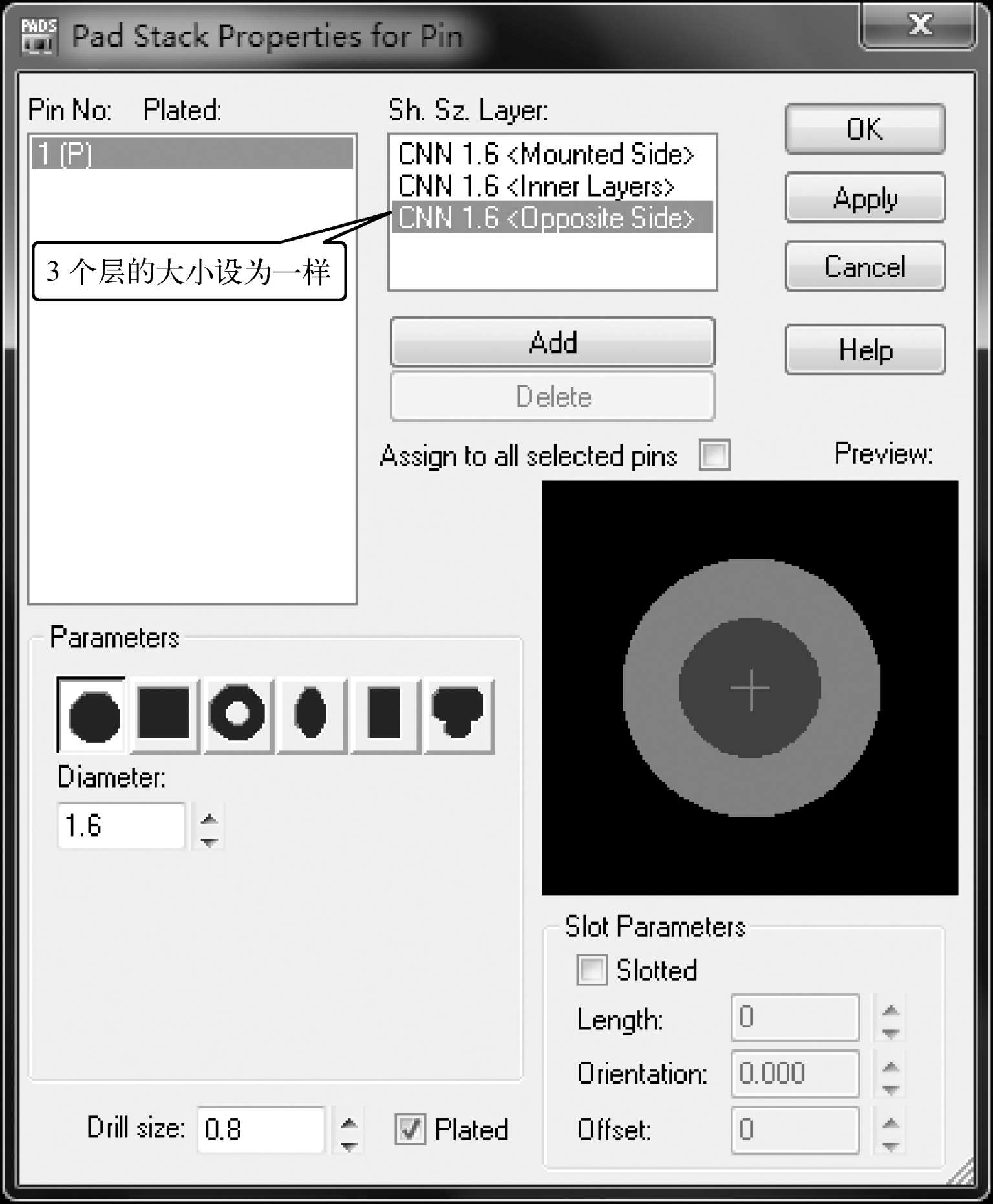 由于当前的焊盘是通孔焊盘,所以Mounted Side、Inner Layers、Opposite Side这3个层的值要设置成一样大,本例中同为1.6mm。