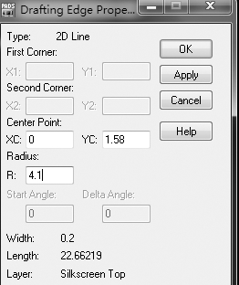 ,开始绘制丝印外框。在工作区中单击鼠标右键,从弹出的菜单中选择“Circle”(圆形),然后在焊盘1和焊盘2之间绘制一个圆,如图7.23所示。双击丝印外框(圆形),弹出“Drafting Edge Properties”对话框,设置圆的半径为4.1mm,圆心坐标为(0,1.58),如图7.24所示。