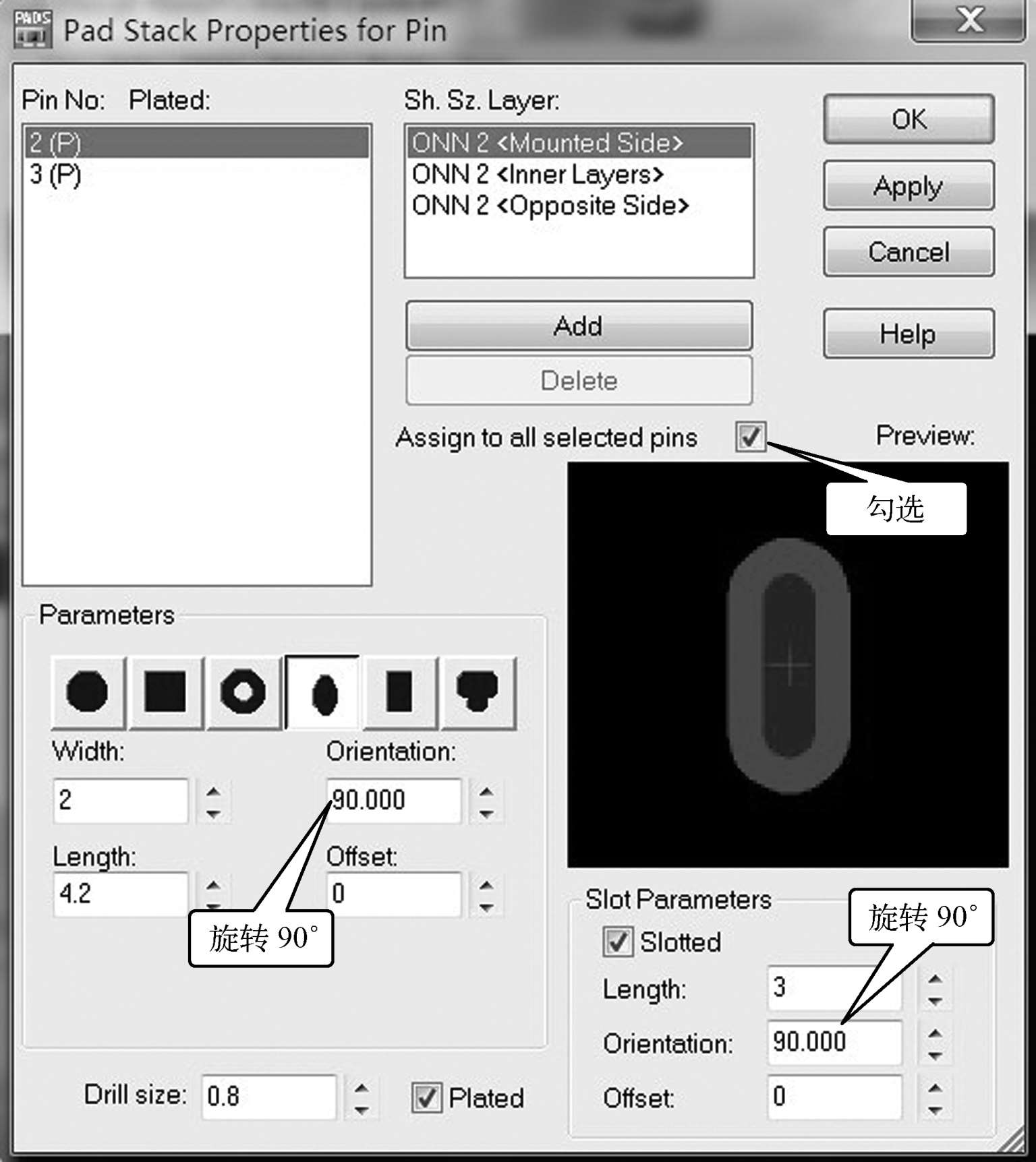 根据实际需要,将焊盘2和焊盘3旋转90°,对应的设置如图7.40所示。旋转效果如图7.41所示。