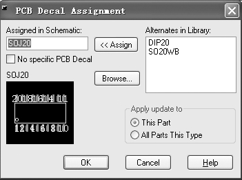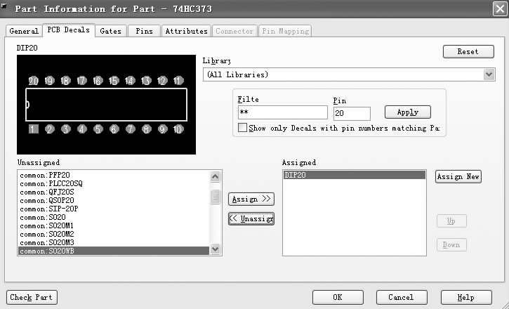 (3)单击“Assign>>”按钮,将选中的PCB封装移至“Assigned”列表框中。图8.1中指定的是DIP20。