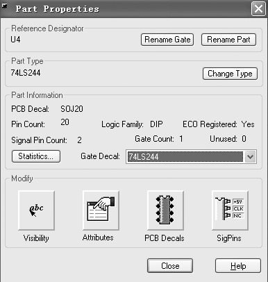 (1)在PADS Logic中选择元器件,单击鼠标右键,从弹出的菜单中选择“Properties”,弹出“Part Properties”对话框,如图8.2所示。