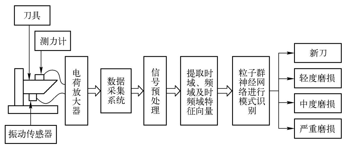 尺寸精度造成影响,有时更会对工件及人身产生危害,故应该及时发现问题并有效解决。刀具磨损是刀具失效的主要形式之一,它变化缓慢,是一个渐进过程。对于传统的机械加工,工人通过机床振动和切削情况等能够判断刀具磨损的程度;而对于现代的自动化加工,系统可自动地评估其状态且能够及时换刀,有效防止因刀具过大磨损程度而影响工件质量及加工效率等。因此,准确掌握刀具磨损状态,诊断刀具损伤故障,对加工过程中延长机床正常运行时间和提高加工质量至关重要。据统计,刀具状态监测技术的成功应用使得因人为等因素导致的停机时间可降低75%,生产率提高10%~60%,机床利用率也提升50%以上。因此可知,刀具状态监测技术极大地推动了机械加工向无人化与自动化的方向发展,具有重要的实用价值。