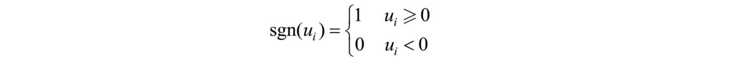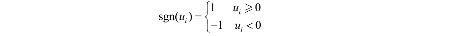 其中,y=[y 1 ,y 2 ,…,y n ] T ,x=[x 1 ,x 2 ,…,x n ] T 和u=[u 1 ,u 2 ,…,u n ] T 为网络的状态矢量,其分别为Hopfield神经网络第2层的输出、第1层的输入和总输入,y中的所有元素值仅取1或-1;由于神经网络的第0层没有外界输入,因此认为Hopfield神经网络没有输入;θ=[θ 1 , θ 2 , …, θ n ] T 为网络的阈值矢量;W=[w ij ] n×n 为网络连接权矩阵,其元素w ij 表示第j个神经元到第i个神经元的连接权,它为对称矩阵。若w ij =0,则称网络无自反馈,否则,称其为自反馈。