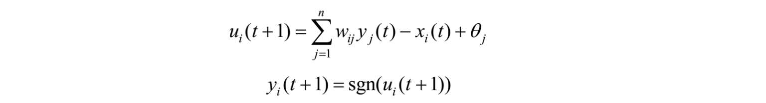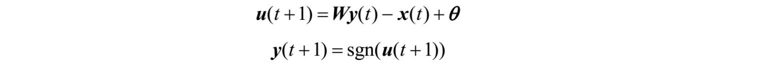DHNN主要用于联想记忆。网络的能量函数存在着一个或多个极小点或称平衡点。当网络的初始姿态确定后,网络状态按其工作规则向能量递减的方向变化,最后接近或达到平衡点,这种平衡点又称为吸引子。如果设法把网络所需记忆的模式设计成某个确定网络状态的一个平衡点,则当网络从与记忆模式较接近的某个初始状态出发后,按 Hopfield 运行规则进行状态更新,最后网络状态稳定在能量函数的极小点,即记忆模式所对应的状态。这样就完成了由部分信息或失真的信息到全部或完整信息的联想记忆过程。DHNN的计算公式如下: