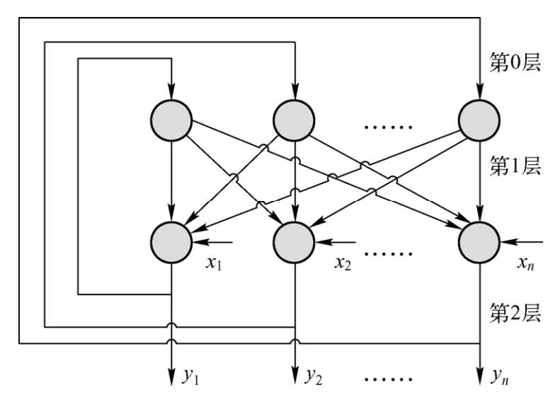 离散型Hopfield神经网络(DHNN, Discrete Hopfield Neural Network)是一种单层的、输入/输出为二值的反馈网络,其拓扑结构如图5-1所示。