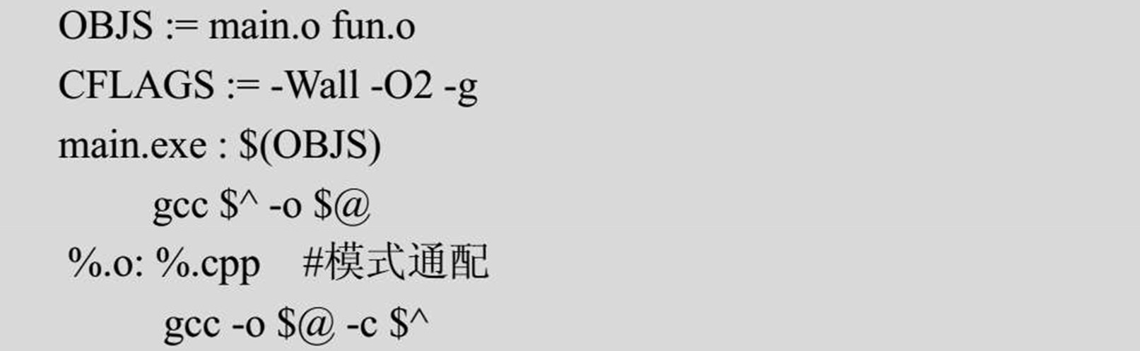 %.o: %.cpp任何目标文件的依赖文件是与目标文件同名的并且扩展名为.cpp的文件。