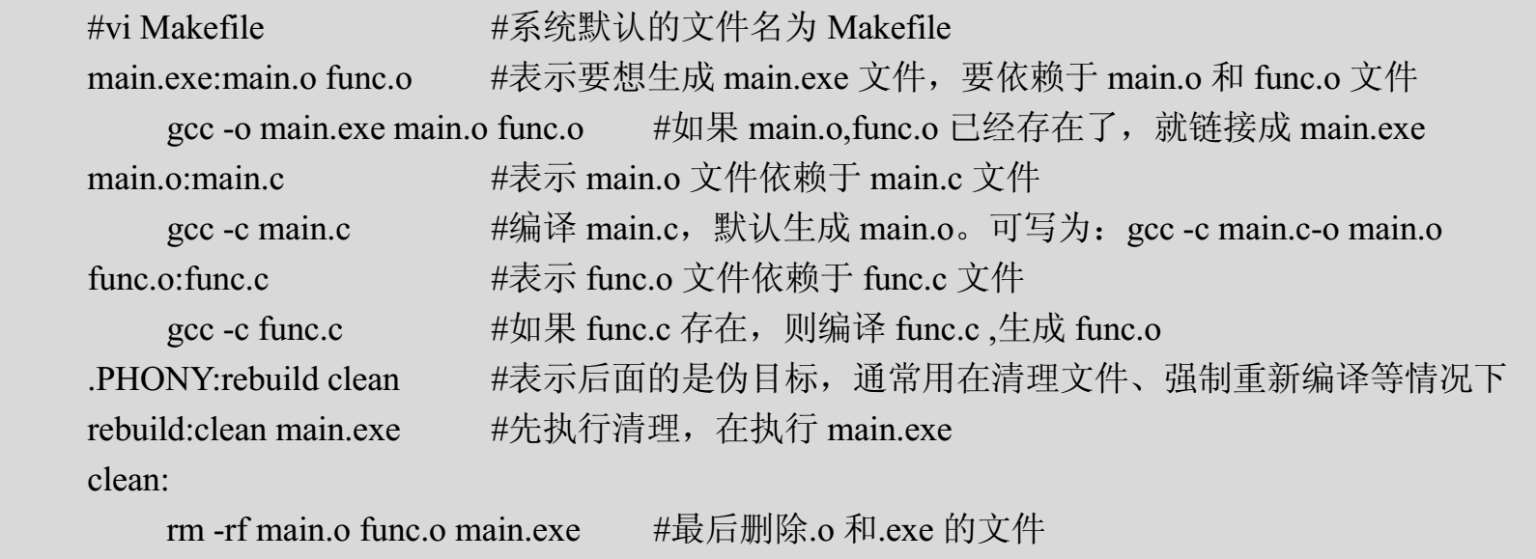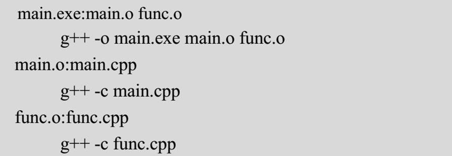 (1)make程序首先读到第1行的目标文件main.exe和它的两个依赖文件main.o和func.o;然后比较文件main.exe和main.o/func.o的产生时间,如果main.exe比main.o/func.o旧,则执行第2条命令,以产生目标文件main.exe。