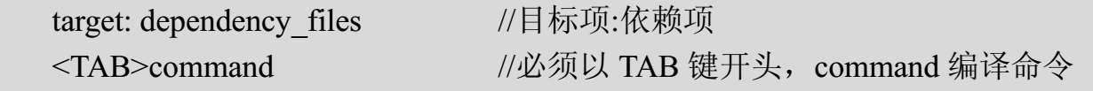 Makefile文件由一个或者多个规则组成,规则由目标、依赖和命令组成,格式如下。