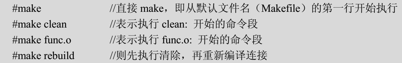 我们可以使用make [目标名]来读取Makefile文件的对应规则。如果make后面不跟目标,则读取该Makefile文件的第一个目标。