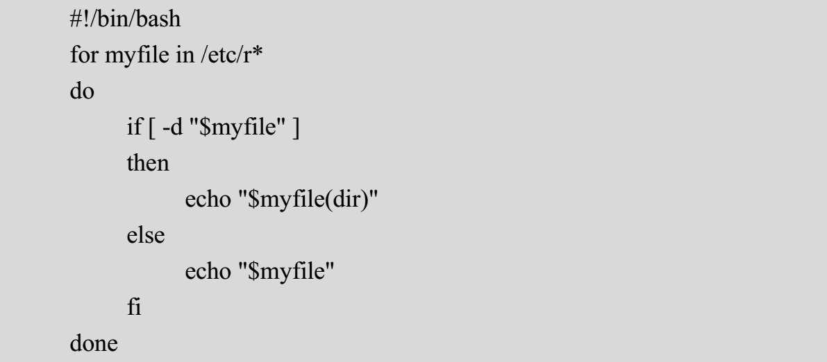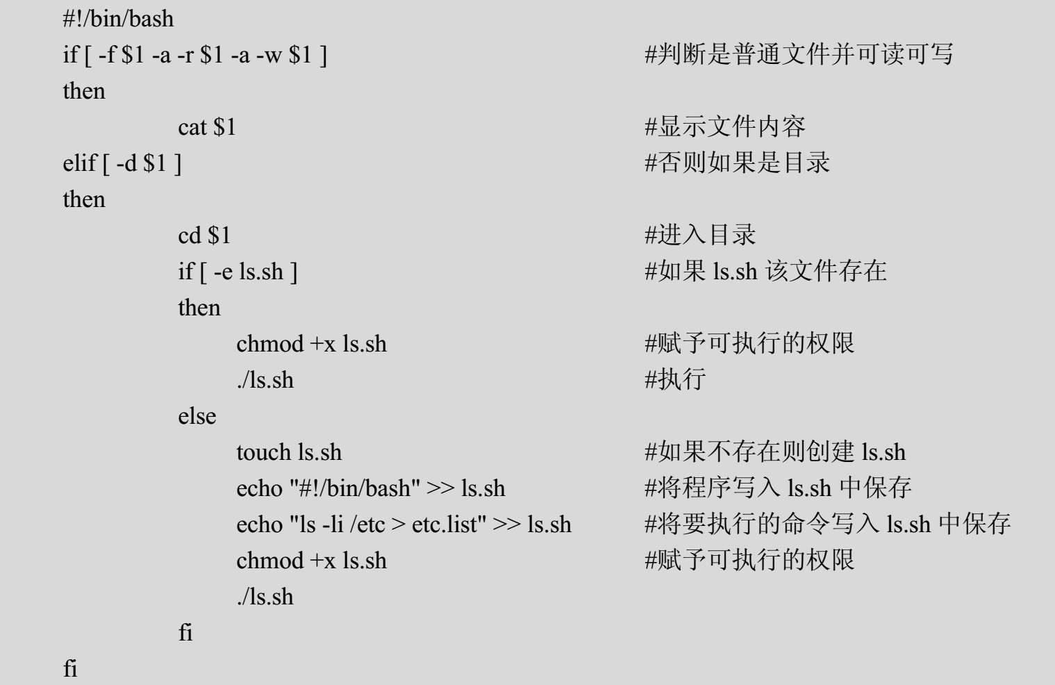 例如,用参数传1个文件名,该文件如果是文件并且可读可写就显示该文件,如果是目录就进入该目录,并判断ls.sh是否存在,如果不存在,就建立1个ls.sh的文件并运行该文件。该文件的内容是ls -li /etc > etc.list