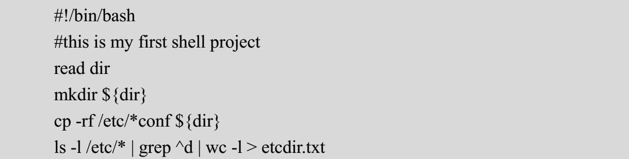 举例,写1.sh要求读入1个目录名,在当前目录下创建该目录,并复制etc下的conf文件到该目录,统计etc下所有目录的数目到etcdir.txt中。