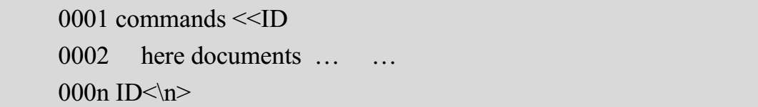 在上面的语法描述中,0001行的commands是任何shell命令。ID是一个字符串标符,标志着嵌入文档的开始(习惯上,常用的标识符是EOF,等等)。