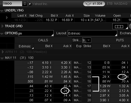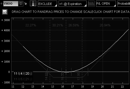 2011年4月19日,雅虎YHOO股价报16.69。期权报价链如下图所示。