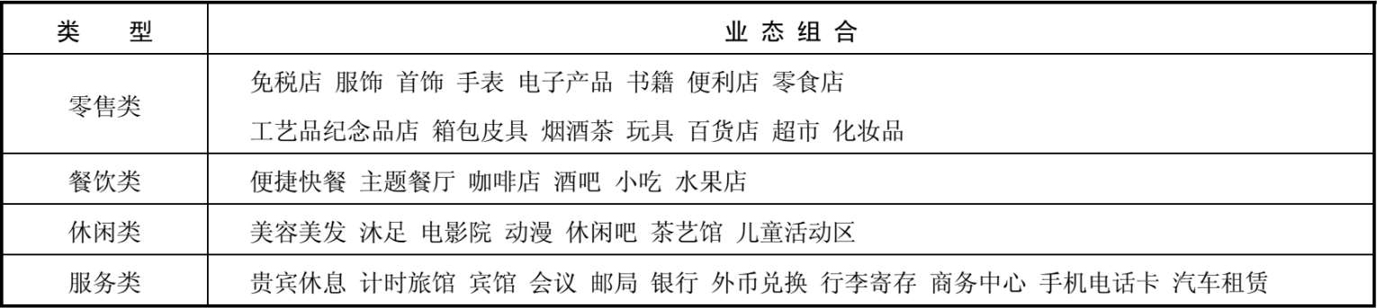 从我国枢纽机场的旅客需求和未来发展来看,机场商业功能类型可以分为零售、餐饮、休闲、服务等四大类 [9] (见表1-1),体现了机场社会化、旅游化、商业化的发展趋势。机场商业设施是实现机场商业功能的保障。