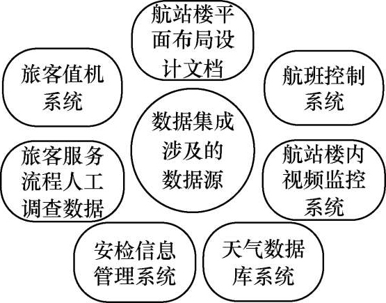 为实现上述目标,需要来自旅客离港控制系统、安检信息管理系统、航站楼视频监控系统等多个数据源的数据,以支持航站楼旅客流量预测、行李处理需求预测,航站楼旅客流量异常预警和旅客服务资源配置及调度的仿真优化。当前,这些数据源分属于不同的、彼此独立的信息系统中,每个系统都有自己特定的任务和特定的数据结构,难以实现系统间在数据层面的互操作。为有效支持旅客服务资源的动态配置及调度,必须对与航站楼旅客服务资源动态配置及调度有关的数据进行集成,确保数据组织的合理性和快速响应数据查询请求的能力。航站楼旅客服务资源动态配置及调度数据集成是实现旅客服务资源动态配置及调度的基本保障。