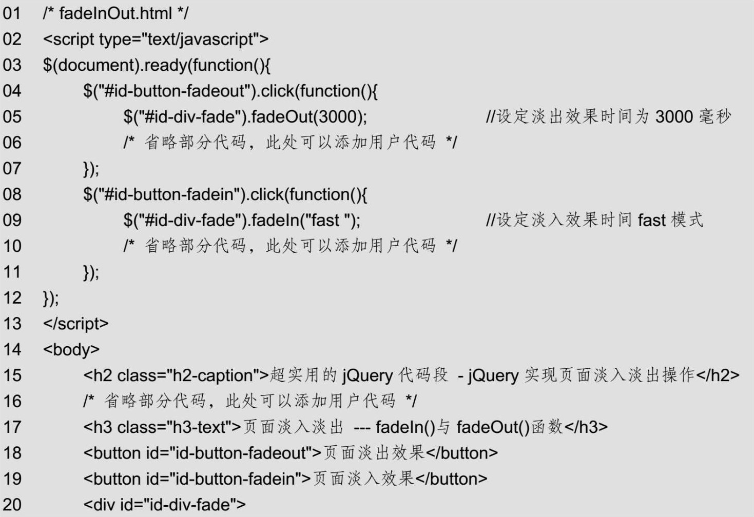 第04~07行实现的“淡出”效果通过fadeOut()函数实现,该函数使用淡出效果来隐藏被选择的页面元素,其语法如下: