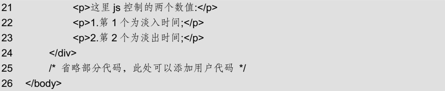 第08~11行实现的“淡入”效果通过fadeIn()函数实现,该函数使用淡入效果来显示被选择的页面元素,其语法如下: