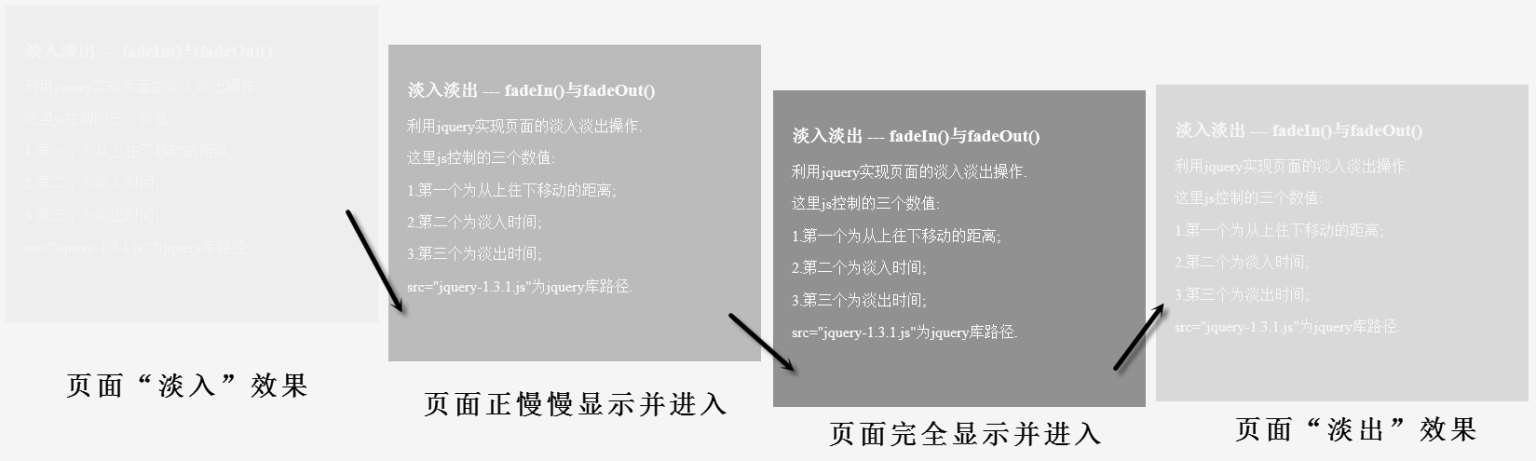 使用PowerPoint编写过幻灯片报告的用户,肯定对幻灯片切换时的“淡入淡出”效果印象颇深。其实,在网页开发中使用jQuery框架实现整个页面的“淡入淡出”效果也很方便,如图1.3所示。