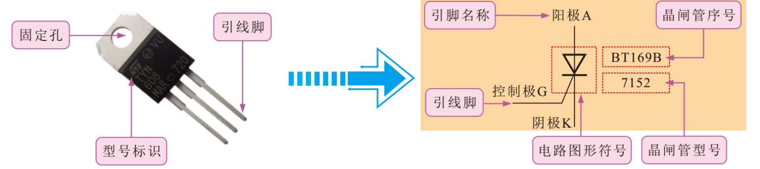 电路图形符号表明了晶闸管的类型;引线由电路图形符号三端伸出,与电路图中的电路连通,构成电子线路;标识信息通常提供了晶闸管的类别、在该电路图中的序号及晶闸管型号等参数信息。