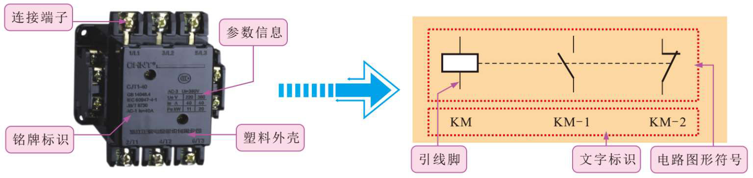 电路图形符号表明了接触器中触点的个数,触点的类型;文字标识起始字母相同,表明属于同一个接触器的不同组成部分,如线圈、常开触点、常闭触点。