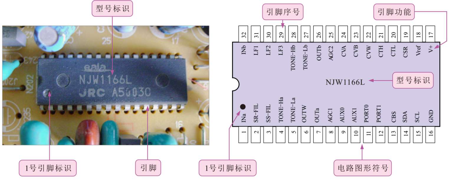 图1-80为典型音频信号处理集成电路(NJW1166)的外形特点与电路标识方法。