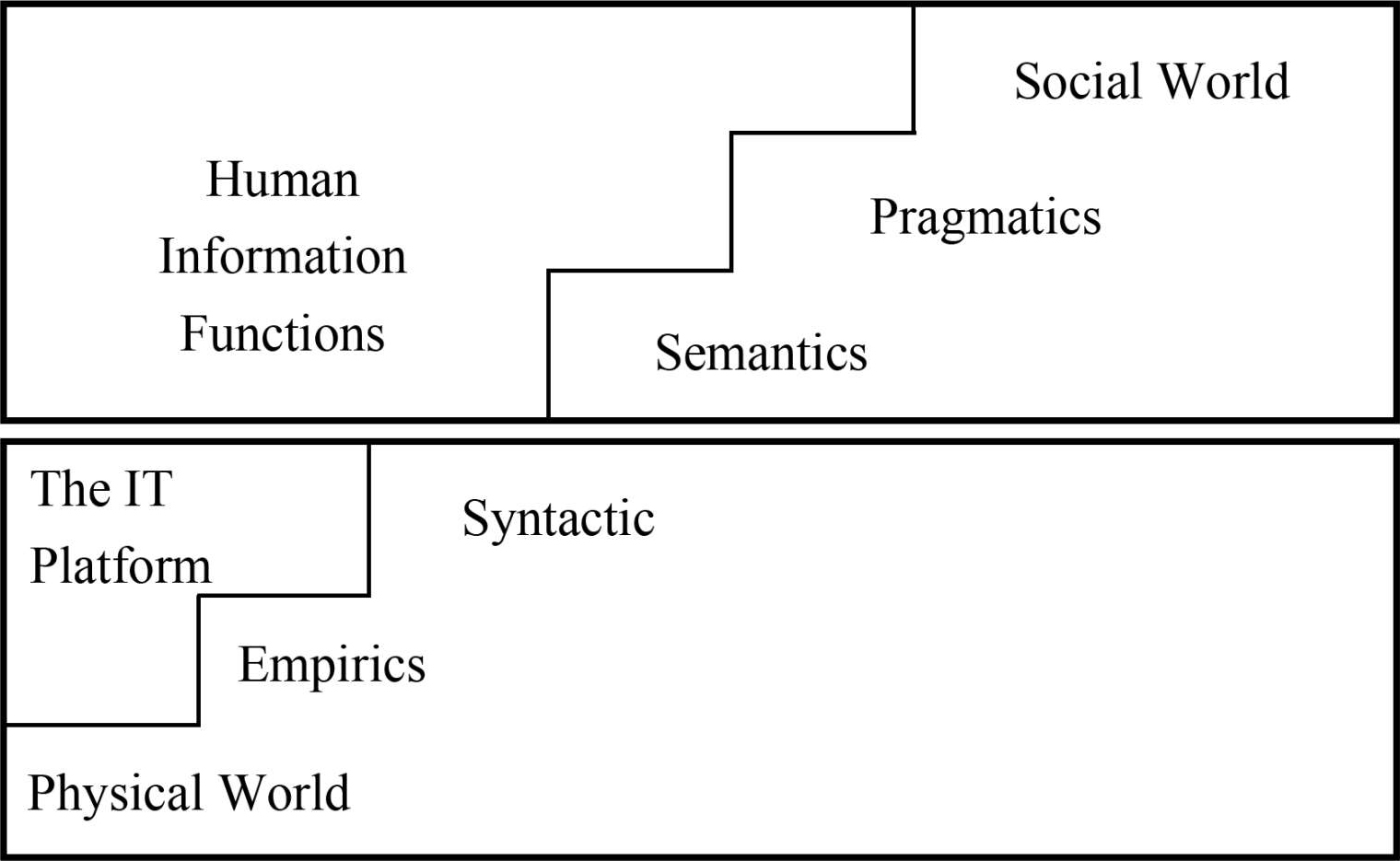 Traditionally, the framework of semiotics has three parts, syntactic,semantics and pragmatics. Then, Stamper (1973) added three more parts,physical world, empirics and social world to the framework, as shown in Figure 2.12. Physical world studies the physical aspects of signs; empirics concerns the statistical properties of signs; syntactic discusses the structure of signs; semantics deals with the signs’ meanings; pragmatics focuses on the usage of signs, and the social world on the top argues the effect of the use of signs in human world. The upper three levels focus on the use of signs and the lower three levels concern the organisation of signs.