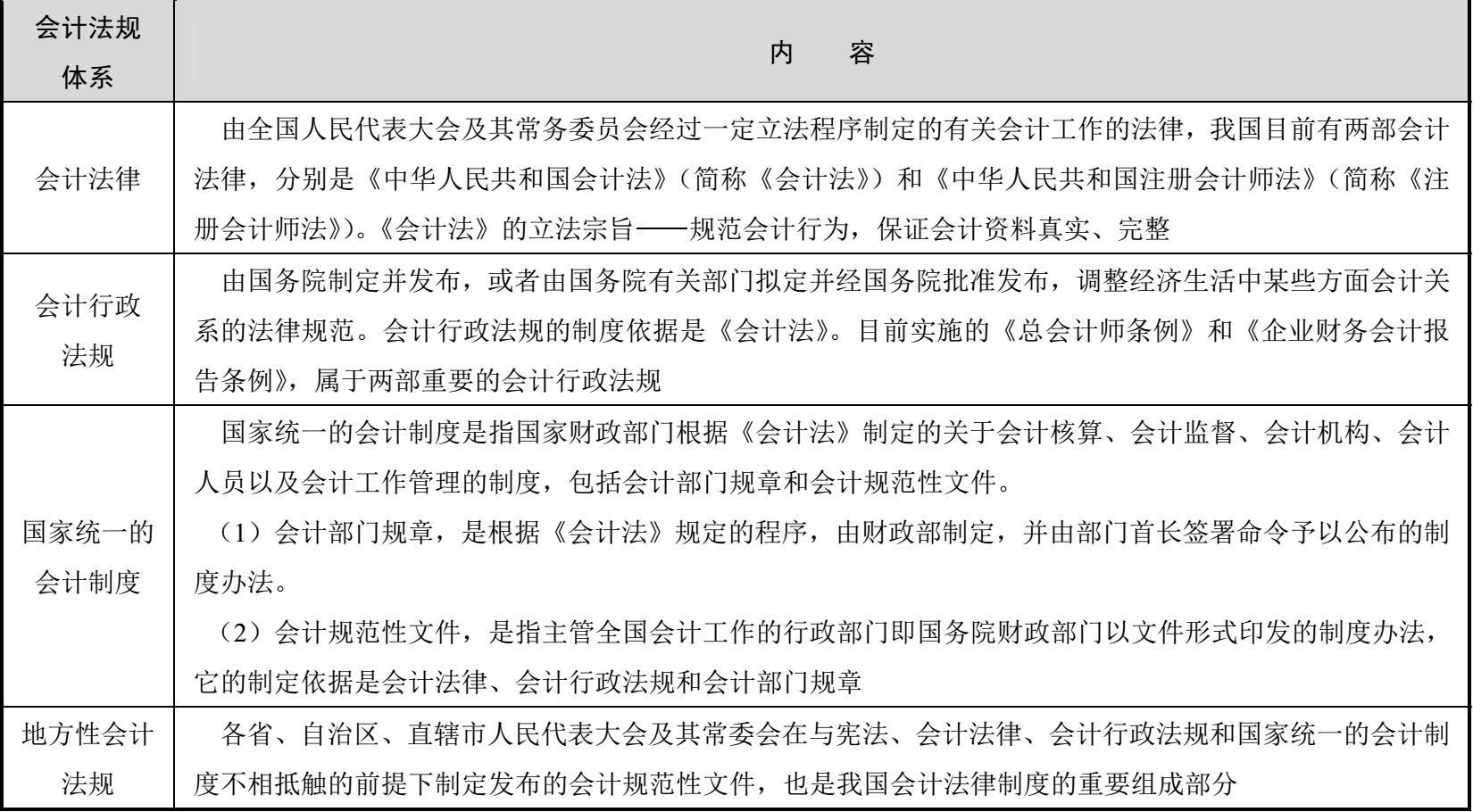 会计法律体系是指由国家权力机关或其他授权机构制定的,用来规范会计核算实务、会计基础工作、会计主体和相关会计人员职责,以便及时调整经济活动中各个会计关系的规范性文件的总和。它们构成了我国会计从业人员必须遵守的职业纪律和规范。