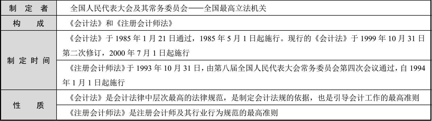 这里主要介绍我国的会计法律的制定者、构成、制定时间和相关性质,如表1-1所示。