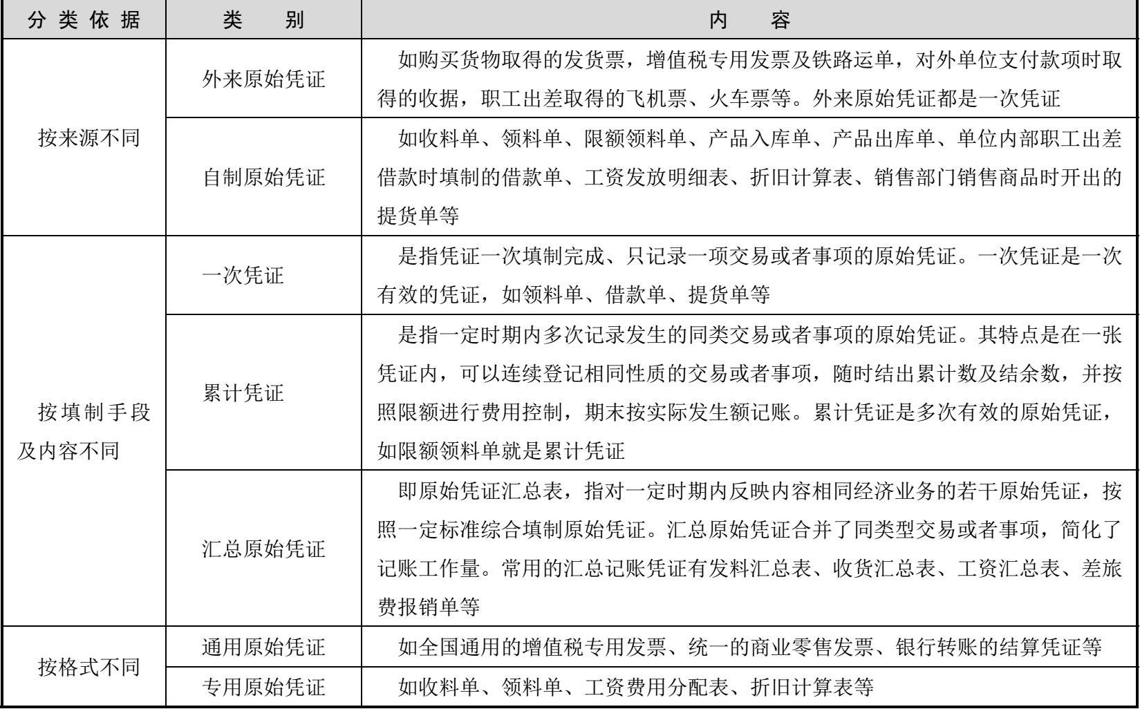 由于各种经济业务的内容和经营管理的要求不同,原始凭证的名称、格式和内容是多种多样的。原始凭证填制的依据和填制的人员有三种:以实际发生或完成的经济业务为依据,由经办业务人员直接填制,如入库单、出库单等;以账簿记录为依据、由会计人员加工整理计算填制,如各种记账编制凭证;以若干张反映同类经济业务的原始凭证为依据,定期填制汇总原始凭证,填制人员可能是业务经办人也可能是会计人员。但无论哪种原始凭证,作为记录和证明经济业务的发生或完成情况、明确经办单位和人员的经济责任的原始证据,基本含有的内容是一样的。
