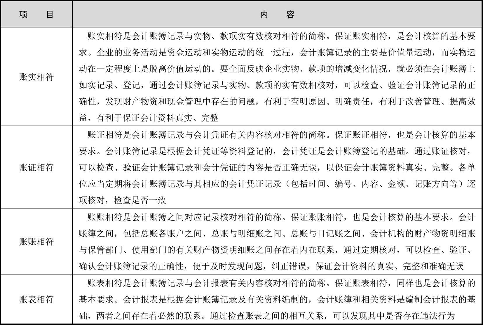 账目核对也称对账,是保证会计账簿记录质量的重要程序。根据《会计法》的规定,账目核对要做到账实相符、账证相符、账账相符和账表相符,如表1-6所示。