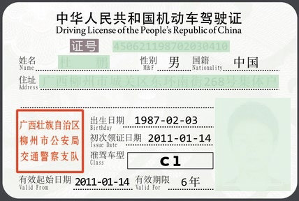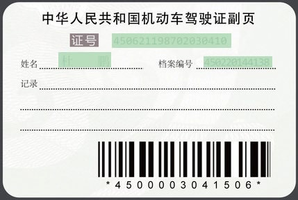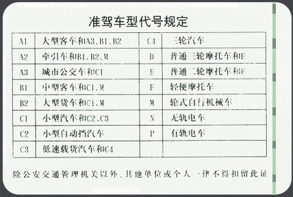 驾驶证主页如图1.1.1所示,主页记载机动车驾驶人信息,包括“证号”、“姓名”、“性别”、“有效期限”等中英文对照字,以及证件专用章和照片;主页背面是“准驾车型代号规定”。