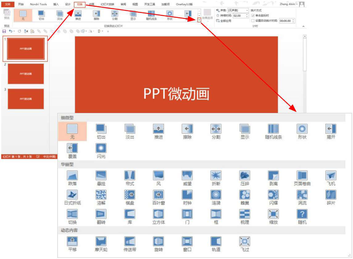 分为细微型、华丽型和动态内容 3 类,共计 47 种切换动画效果。