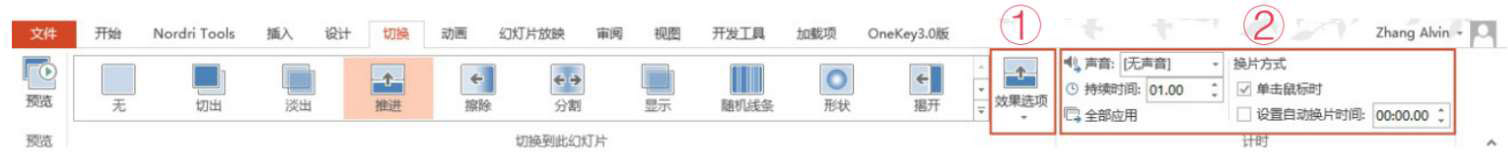 ①效果选项。 选中已添加切换动画的页面,单击【切换】选项卡→【效果选项】按钮,根据需要选择切换效果的选项即可。 快捷键:Alt →K →O ,如下图(①)所示。