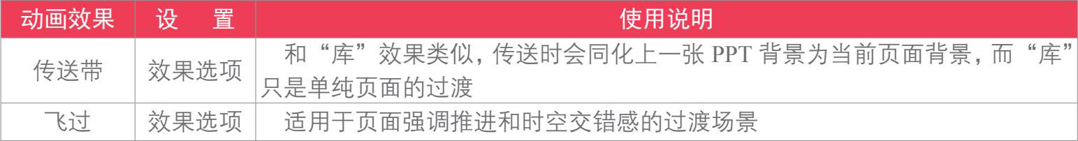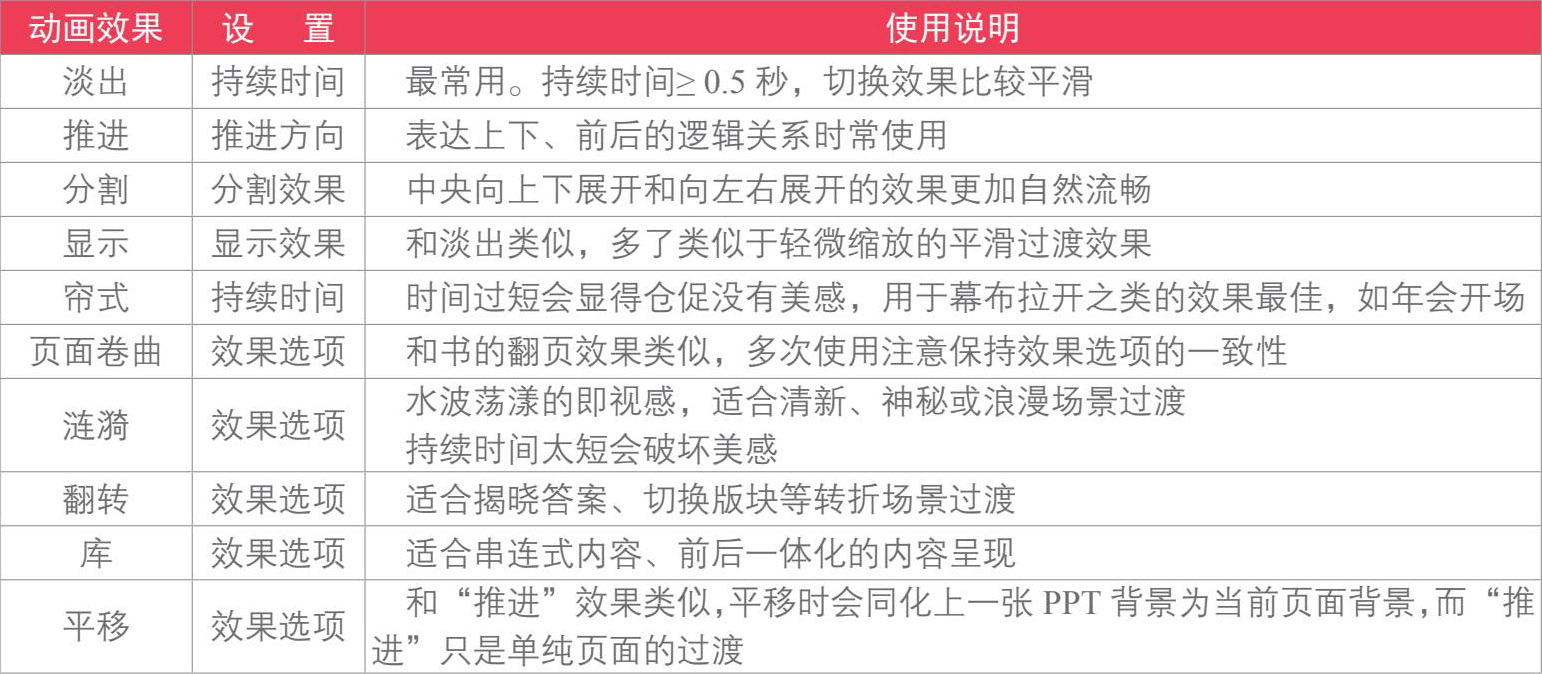 在 2.6.2 节切换动画分类中,标为红色的动画效果为制作微动画时常用的切换动画效果,共 12 个,占比 25.53%,现将它们的动画效果、动画设置和使用说明进行汇总阐述,见下表: