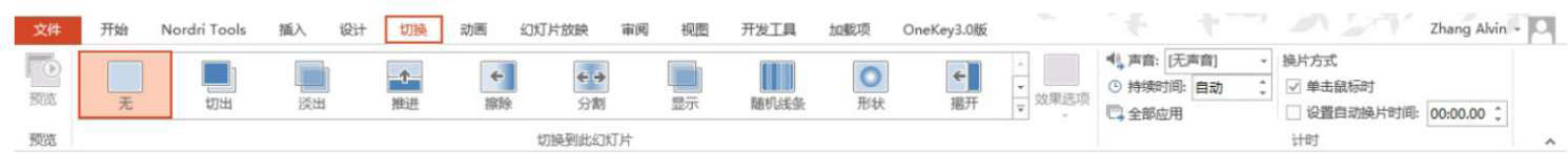 选中准备取消切换动画效果的PPT页面,单击【切换】选项卡下快速操作区域的【无】选项即可,如下图所示。
