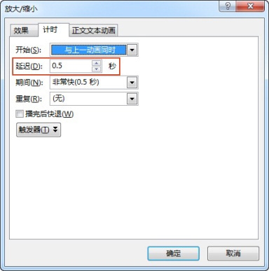 ④单击【动画窗格】按钮,依次双击后五个【飞入】动画,在弹出的【飞入】对话框中的【计时】选项卡下进行【延迟】的设置,【延迟】依次递增 0.01秒即可(延时分别为:0.01、0.02、0.03、0.04、0.05)。【延迟】递增 0.02 秒也可, 如果延迟时间幅度大了,重影的效果会失真。 动画窗格布局,如下图所示。